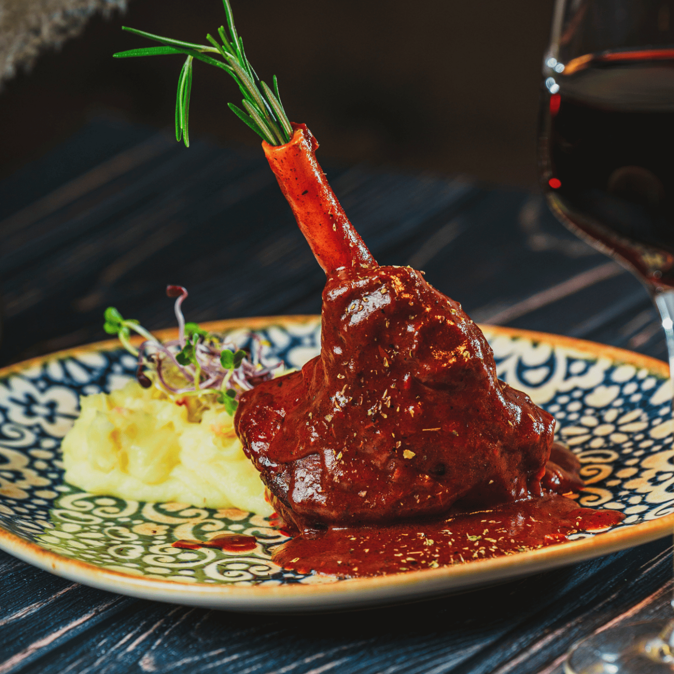Langsam geschmorte Lammkeule, butterzart und tief aromatisch, serviert in einer kräftigen, würzigen Sauce.