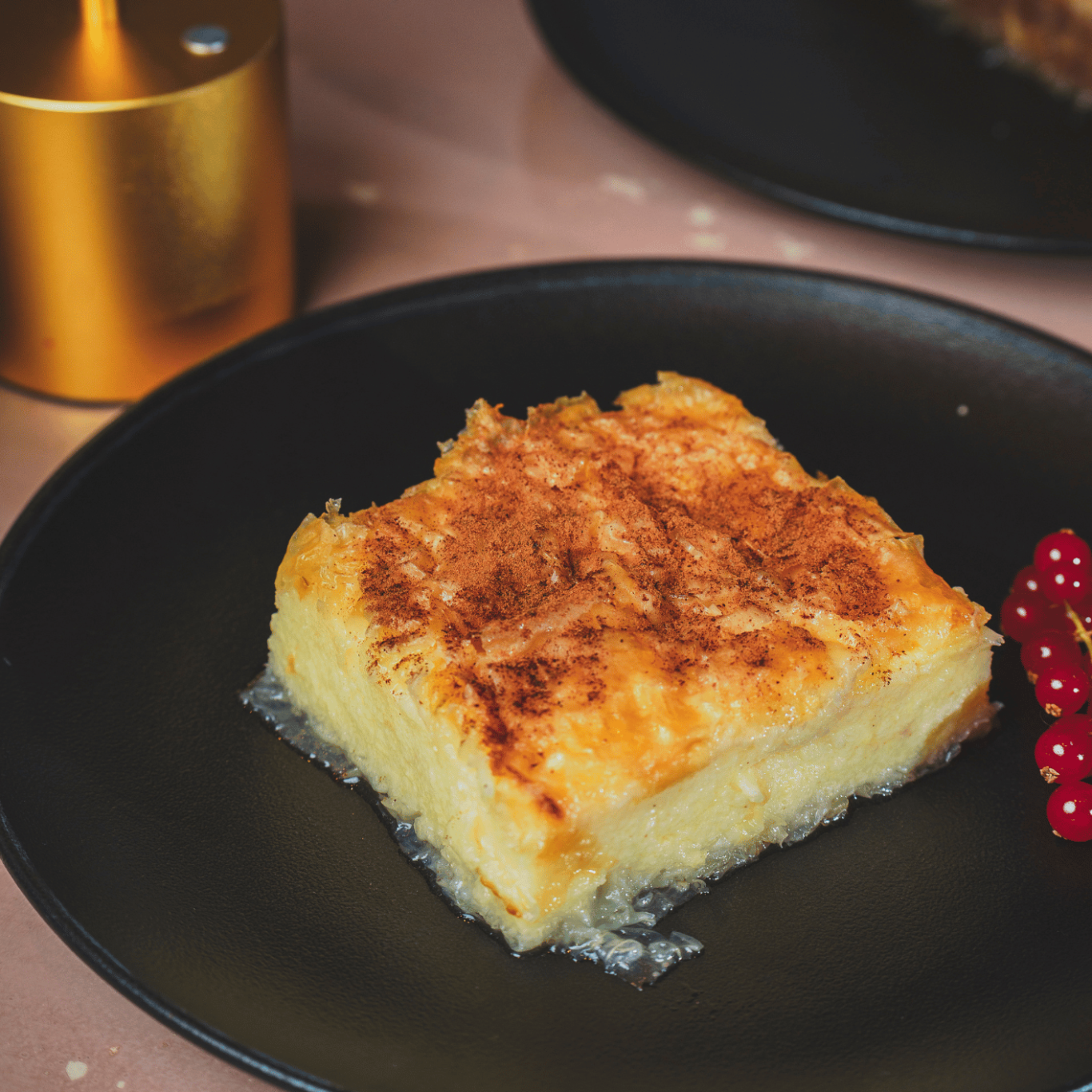 Zarter Blätterteig, gefüllt mit cremiger Grießfüllung und goldbraun gebacken – serviert mit einer feinen Note Vanille. Ein klassisches griechisches Dessert, elegant und unwiderstehlich.