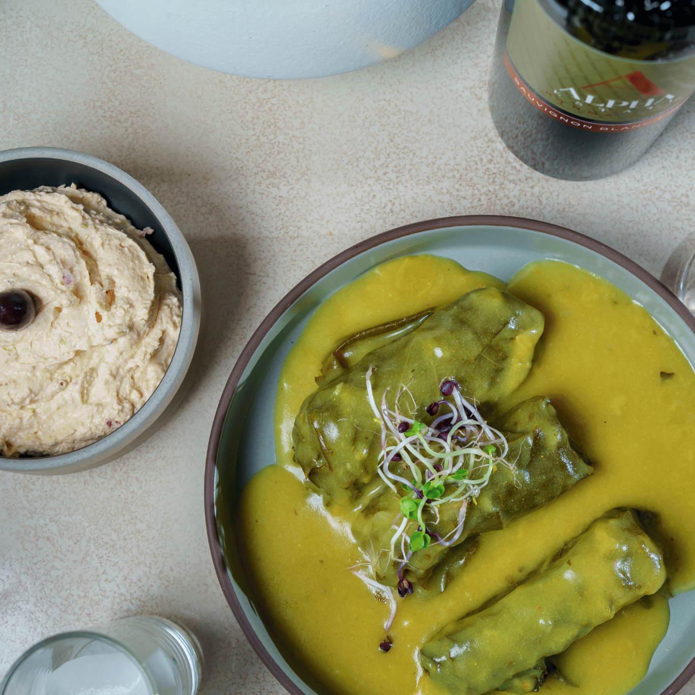 Zart gefüllte Weinblätter, hausgemacht nach traditioneller Art und serviert in einer cremigen Zitronen-Ei-Sauce (Avgolemono).