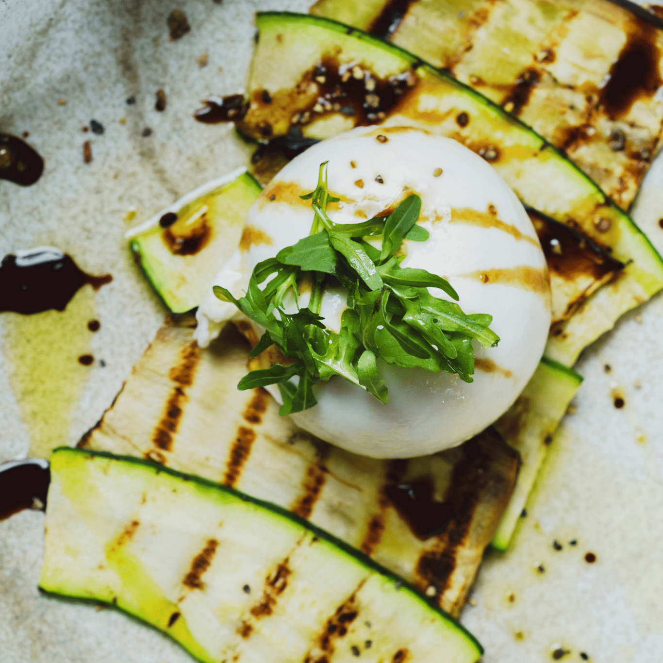 Zart gegrillte Zucchinischeiben, kombiniert mit einer cremigen Burrata und verfeinert mit aromatischer Balsamico-Reduktion sowie frischem Rucola.