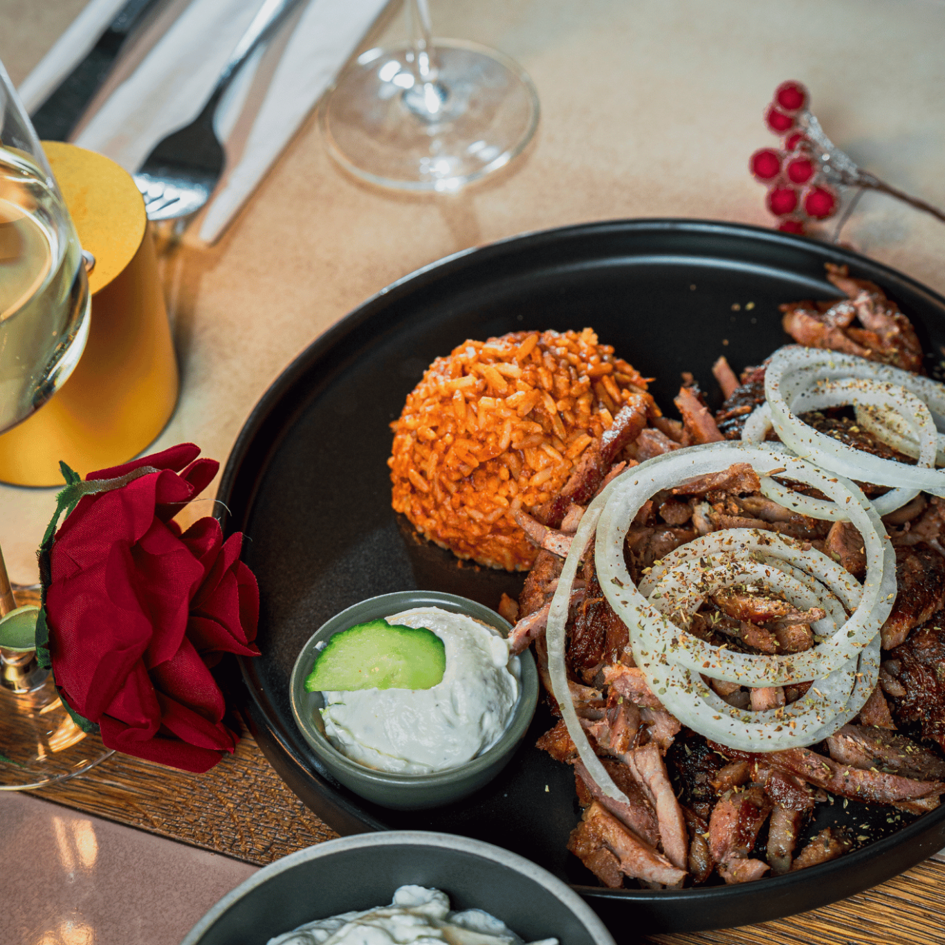 Zartes, fein gewürztes Gyros vom Drehspieß – serviert mit aromatischem Tomatenreis, cremigem Zaziki und frischen Zwiebeln.
